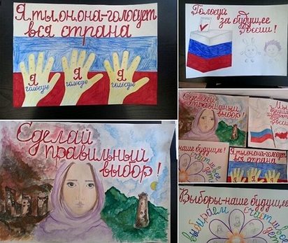 МБОУ "СОШ с.Тазбичи имени Г.Х. Юсупова"(Акаева Хава, ученица 10 класса; Газгериев Ахмед, ученик 8 классаМуртазов Муса, ученик 7 класса:Газгериева Хамзат, ученица 6 класса;Муртазова Петимат, ученица 4 класса), участвующих в республиканском конкурсе рисунков и плакатов "Выборы глазами детей", который проводится