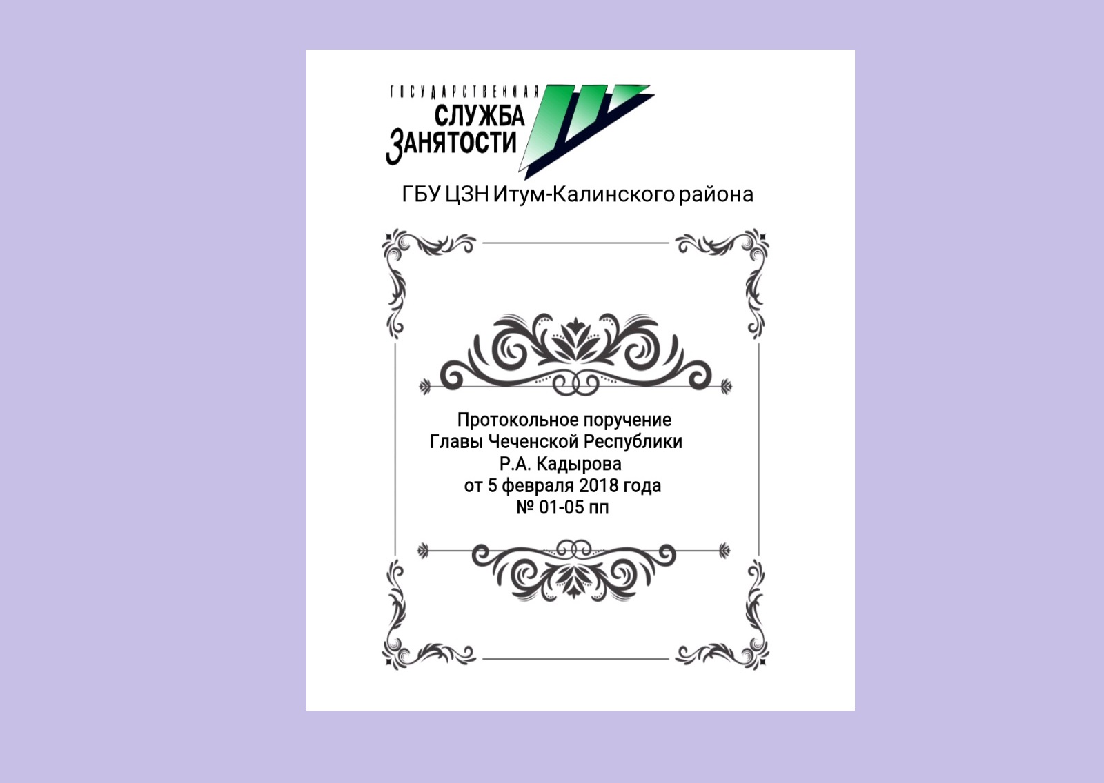 Во исполнение протокольного поручения Главы Чеченской Республики Р.А. Кадырова от 5 февраля 2018 года № 01-05пп, ГБУ «Центр занятости населения Итум-Калинского района» (далее – ЦЗН) ведется масштабная работа.